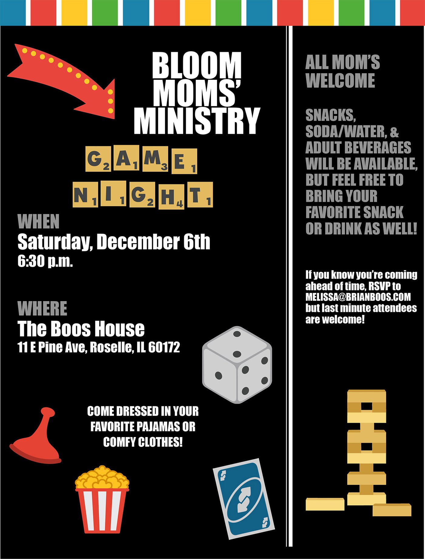 All Moms are invited to join us for Moms Game Night at 6:30 pm on Saturday, December 6.